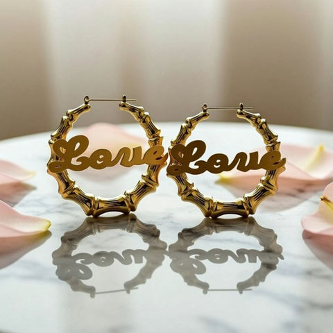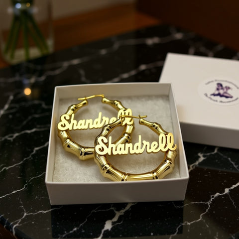 Our top quality .925 sterling silver or gold vermeil bamboo name hoop earrings made in our studio, in the USA. Our Personalized Bamboo Hoop Name Earrings are custom made by hand from 14K gold vermeil (14K gold over .925 sterling silver) or .925 Sterling Silver. Both the hoops and nameplates are both .925 sterling silver or 14K gold vermeil. The earrings measure a large 2.36" (60mm) diameter or an extra large 3" (75mm). Two earrings included. You can choose a different name for each earring if you like.